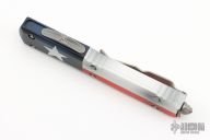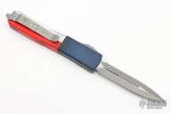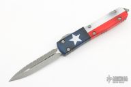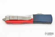 This Ultratech OTF automatic by Microtech features an Apocalyptic finished double edged blade with a fully serrated edge and satin finished flats. Red, white and blue aluminum contoured frame with a tip down stainless steel clip. Dated 03/2023. Serial Number 179.  New from maker at the 2023 Blade Show Texas