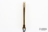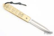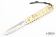 This Mexicana Divorcio side opening automatc from Rob Dalton features a satin finish spear point blade with a partially sharpened swedge at the the tip. The handle is comprised of a milled brass frame that is numbered 12 on the presentation side. Lanyard hole with lanyard and bead on pommel. Excellent condition. Comes with a zippered case.