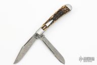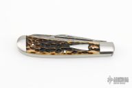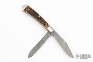 Case and Tony Bose collaboration in 2021. Two raindrop Damascus blades with half stops. Satin stainless pinched bolsters and molasses jigged bone covers with stainless steel escutcheon. Very well made knife for a fraction of a custom Bose trapper. Comes with original box, papers and zippered case. Excellent condition.
