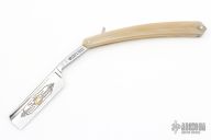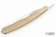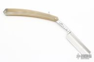 This 6/8 Straight Razor by Thiers Issard features a hollow ground blade with notched finger rest, blond cow horn tip handle. Comes with original box sheath and papers. New condition.
