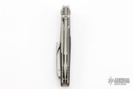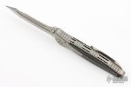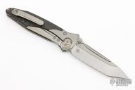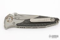 This Socom Bravo by Microtech is made in China by Rike Knife, it features a bead blasted blade with a fully serrated edge, notched thumbrest, and dual thumbstuds. The handle has bead blasted titanium bolsters/liners, anodized pivot collars, carbon fiber scales. Tip up carry bead blasted titanium clip. Bead blasted titanium backspacer. Dated 04/2022 and s/n 0972. Comes with original box and papers. Excellent condition.