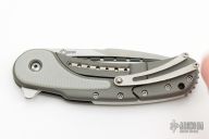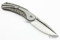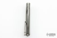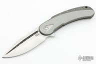 This Bodega flipper by Todd Begg Knives features a satin finished blade with a false top edge. Bead blasted titanium frame with grey g10 inlays with cracked ice finish, matching titanium backspacer, tip up pocket clip and pivot collar. Includes IKBS (Ikoma-Korth Bearing System) for smooth and fast opening that requires no wrist action. Outstanding work. Comes with a zipper case. Has some scuffs on the frame, otherwise excellent condition. One of the first.