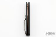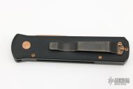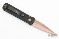 This Godson by Pro-Tech features a satin rose gold finished blade with false top edge. The handle has a black aluminum handle with black tip up stainless steel clip.  Comes with original box and pouch. Has scuffs, scratches, and a few dings. Fair condition.