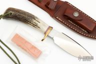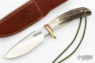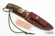 The Model 11 is the original drop-point blade. Designed by Tommy Thompson, noted Alaskan guide, in 1952 for big-game skinning, with point dropped below top of blade to prevent cutting too deeply through skins when used point first. The blade is satin finished with a notched thumbrest, .222" blade stock and 1.368" blade depth, hidden tang construction. The handle has a brass guard, stag handle, red/white/blue spacers, lanyard hole in the butt and a compass in the butt. Comes with a brown leather sheath with sharpening stone and original papers. Excellent condition.