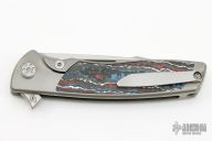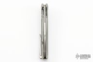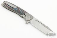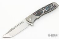 This Mini EVO Flipper from Brian Nadeau features a hand rub satin finished blade with a fullers, thumbhole, flipper and notched thumbrest. The handle is comprised of a bead blasted titanium frame with Nebula Fat Carbon inlays, satin titanium tip up clip. Rides on bearings, nice detent, lockup and blade seating, stainless lockface insert. Comes with original box. New from maker!