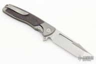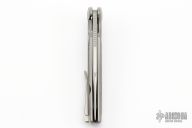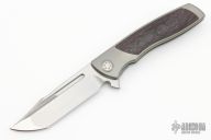 This Mini EVO Flipper from Brian Nadeau features a hand rub satin finished blade with a fullers, thumbhole, flipper and notched thumbrest. The handle is comprised of a bead blasted titanium frame with Purple Haze Fat Carbon inlays, satin titanium tip up clip. Rides on bearings, nice detent, lockup and blade seating, stainless lockface insert. Comes with original box. New from maker!