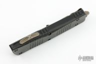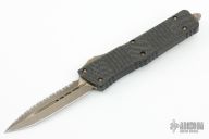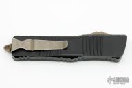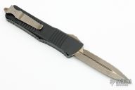 This 142-15 APCFS Combat Troodon from Microtech Knives features a bronze coated double edged spear point blade with fully serrated top edge. The handle is comprised of a Carbon Fiber Top and aluminum base with bronze coated hardware and tip down clip. Glass breaker and lanyard bail on pommel. Includes original box and papers. S/N of 455 and dated 08/2021. Has scuffs and scratches, and a few dings in the frame. Great user condition.