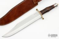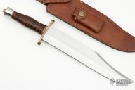 This Bowie by Andre Ronald features a satin finished clip point blade with false top edge, .208" blade stock and 1.907" blade depth, hidden tang construction. The handle has a brass guard, stacked leather grip with red/black/white spacers, aluminum butt. Comes with a brown leather sheath with belt loop. Has some light scratches and patina, otherwise excellent condition.