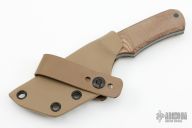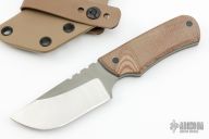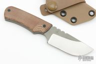 This knife by Joel Green features a two-tone blade with notched thumbrest, .132" blade stock and 1.129" blade depth, full tang construction with natural canvas micarta scales with black liners. Comes with a kydex sheath. Excellent condition.