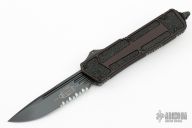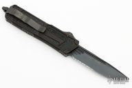 This QD Scarab Navy OTF Auto by Microtech features a single edged satin and black partially serrated blade and black aluminum handle with nonslip inlay, black thumb slide with tritium inlay. Blade is marked "QD SCARAB" on the front, and "PATENTS PENDING CAGE 58283" Includes a Microtech box with original papers and nylon sheath. Dated 07/2009. Excellent condition.