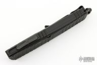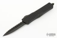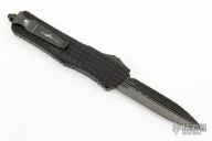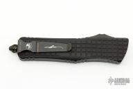 This Combat Troodon OTF automatic by Microtech knives features a double edged, DLC finished reverse full serrated blade. The handle has a DLC frag pattern aluminum handle with black hardware, tip down carry. Glass breaker. Comes with original box and papers. Excellent condition. s/n 348 dated 07/2021.