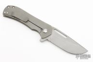 This Recon Flipper by Doc Shiffer features a bead blast finished blade with thumbhole, flipper and fileworked thumbrest. The handle is tumble finished titanium with matching tip up clip. Rides on bearings, nice detent, lockup and blade seating. Comes with a COA dated 3/23. New from maker.