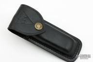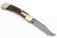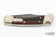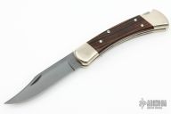 "This old classic BUCK knife 110 "Folding Hunter" was first introduced in 1965 - it has been BUCKS mainstay ever since. Some say the Buck 110 is the most copied knife in the world. This Buck automatic knife has a beautiful dymondwood scales with nickel silver bolsters and a plate that opens knife automatically. A must for any BUCK collection." The blade has been darkened. Has some light scratches, otherwise excellent condition. Left Handed. Comes with black leather sheath and original packaging.