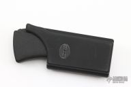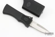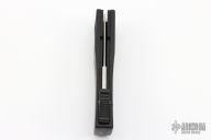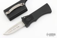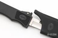 This knife by Bear MFC features a satin finished blade with false top edge. The handle is black zytel type material with slide lock on the spine. Comes with a black molded sheath with clip. Designed by Michael Collins. Has some light scratches, otherwise excellent condition.