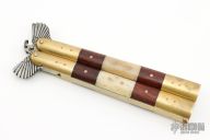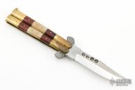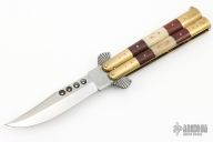This Balisong features a satin finished drop point blade. The handle has brass bolsters and liners with bone and wood scales and a brass t-latch. Has some scratches and patina, otherwise good condition.