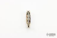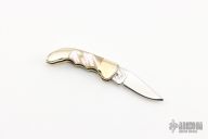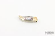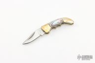 This miniature slipjoint by "SW" features a polished blade with nail nick. The handle has brass bolsters with integral liners, abalone inlays, steel spring. Comes with a small presentation box. Excellent condition.