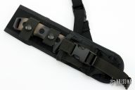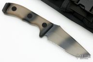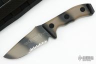 This Currahee by Microtech has a black camo tanto blade with a serrated edge and camo tan polymer scales. 3/16" blade stock and 1 1/2" blade depth, full tang construction. Dated 09/2006 and S/N 00153. Comes with nylon sheath and original box. Excellent condition.