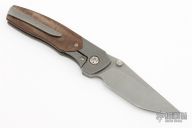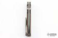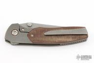 This Dukling by Kody Eutsler features an acid tumbled blade with dual thumbstuds. The handle has a stonewashed titanium frame with brown canvas micarta scales and pivot collars, tumbled titanium backspacer and tip up clip with hidden screws. Rides on bearings, nice detent, lockup and blade seating. Comes with a zippered case and COA. Excellent condition.