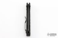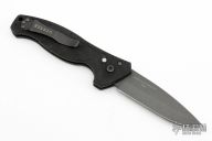 This Gerber Emerson Alliance tactical knife has a black drop point blade. Handle is black anodized aluminum with milled scales and notched thumb rest, safety button, lanyard hole, and black stainless steel tip up clip. Comes with original nylon sheath. Excellent condition. This was the first auto that Gerber ever made.
