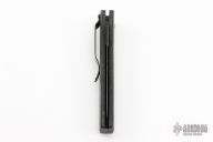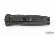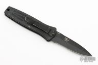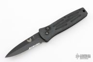 This 3550 Mel Pardue designed side opening auto from Benchmade has a black spear point partially serrated blade with a false top edge. Handle is matte black finished aluminum with milled contours, spine-thumb safety button, black stainless steel tip down clip, and lanyard hole. Has some scuffs and scratches, otherwise good condition.