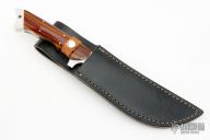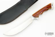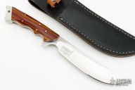 This fixed blade from Tom Barminski features a mirror polished drop blade with .148" blade stock and 1.266" blade depth, full tang construction. The handle has dymondwood scales and aluminum rear bolsters with lanyard hole. Includes a brown leather sheath with belt loop, original box and papers. Box is dated 8/17/98. Excellent condition.
