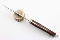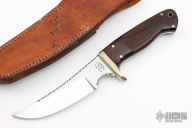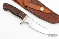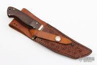 This knife by Glenn Marshall features a mirror polished blade with fileworked spine and choil, .177" blade stock and 1.199" blade depth, full tapered tang construction. The handle has a nickel silver guard, ironwood scales with red liners, nickel silver pins, lanyard hole. Comes with a hand tooled brown leather sheath and a zippered case. Has a couple light scratches, otherwise excellent condition.