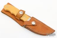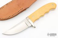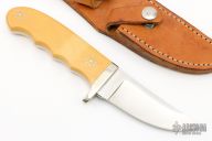This skinner by JD Brooks features a satin finished blade with .187" blade stock and 1.337" blade depth, full tang construction. The handle has a nickel silver guard with yellow paper micarta scales with decorative pins. Coems with a brown leather sheath and a zippered case. Has some light scratches, otherwise excellent condition.