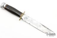 This Ideal Hunter by Marbles was made in Gladstone Michigan. It features a satin finished blade with fullers, .162" blade stock, 1.032" blade depth, hidden tang construction. The handle has a brass guard, stacked leather grip, aluminum pommel, black/brass/red spacers. Has some pitting and scratches, otherwise good condition for its age.