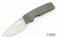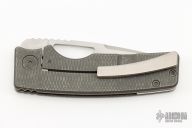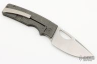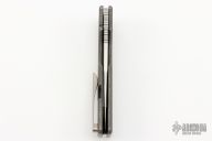This knife by the OZ Machine Company features a tumbled Magnacut blade with thumbhole and notched thumbrest. The handle features a milled and tumbled titanium frame with a titanium backspacer and tip up clip with hidden screws. Includes box and papers dated 10-17-22and s/n 1033.  Excellent Condition.