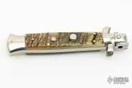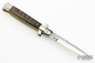 This swivel bolster auto by Latama features a mirror polished spear point blade with a false top edge. Nickel silver guard and rear bolster and rams horn scales. Has safety. Nice function, strong firing and lock up. Excellent condition.