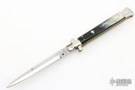 This pick lock auto by AGA Campolin features a mirror polished blade with a false top edge. Nickle silver guard and rear bolster, black/white horn scales, brass liners and a stainless steel backspacer. Nice function, strong firing. Excellent condition. Dated 2017. Comes with a black leather slip sheath and COA.