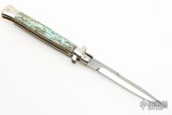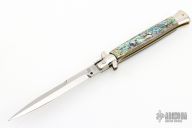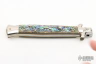 This Swivel Bolster auto by Latama features a bayonet blade with a false top edge. Nickle silver guard and rear bolster and abalone scales. Nice function, strong firing and lock up. Excellent condition.