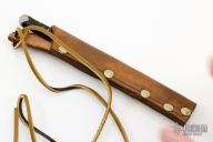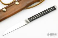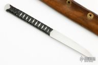This knife by Bruce Gillespie features a chisel ground satin finished blade with .181" blade stock and .455" blade depth, full tang construction. The handle has black leather wrap. Comes with a brown leather neck sheath. Excellent condition.