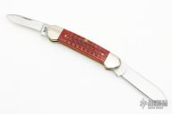 This Canoe 2-Blade Folder by Case Knives has polished stainless steel blades with nail nick(s). The handle has nickel silver bolsters and cap, red jigged bone covers, nickel silver liners and stainless springs. Comes with original box. Has a couple light scratches, otherwise excellent condition.
