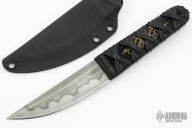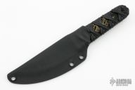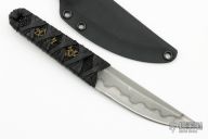 This knife by Ecos Knives features an upswept blade with nice hamon, .148" Blade stock and 1.037" Blade Depth, hidden tang construction. The handle is stingray skin under black cord wrap with brass dragon menukis. Includes kydex sheath. Has some scratches, otherwise excellent condition.