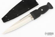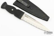 This Culloden by Cold Steel features a satin finished blade with fileworked spine/thumbrest, fully serrated edge, .117" blade stock and 1" blade depth, hidden tang construction. The handle has a rubber grip. Comes with original sheath, original box. Excellent condition.