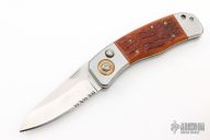 This popular and long discontinued Lake PAL from CRKT features a button lock mechanism. They have been a puzzle that kept knifemakers awake at night. Typically, they have required a complex mix of liner-type springs, top spring bars and a separate pin stop. Then Ron Lake solved the riddle. His patent pending Piston Activated Lock (P.A.L.™) has just one hardened piston which acts as a stop pin and locking and release mechanism. Study it. At first it’s an enigma, then you realize it’s the most user-friendly folder imaginable.