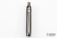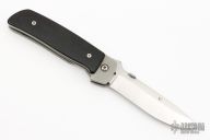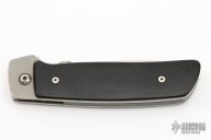 This ATCF from Bob Terzuola features a satin finished drop point blade with swedge, thumbdisc and notched thumbramp. The handle has black canvas micarta scales, titanium frame and liner, black linen micarta backspacer. Has been used, carried, resharpened, has scuffs, scratches, a spot on the blade where the consigner said a battery arched against it. Nice lockup and blade seating. Fair condition.