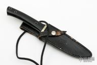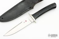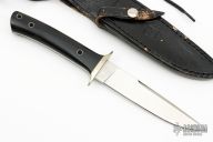 Shiva is the first tactical fixed blade Al Mar made with a laminated VG-10 stainless steel blade. Laminating the VG-10 between two layers of 400 series stainless steel increases the lateral strength of the blade by upwards of 30% and does so without increasing the weight or bulk. The Shiva has a beautiful tapered tang, contoured and polished black linen micarta scales, nickel silver guard. Comes with black leather sheath. Has scuffs and scratches throughout, otherwise good condition.
