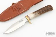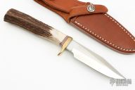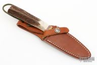 This Model 5-4 by Randall Made Knives features a clip point satin finished blade with false top edge and a notched thumbrest, .147" blade stock, .931" blade depth, hidden tang construction. The handle has a brass guard and stag grip with red/white/blue spacers. Includes a brown leather sheath. Excellent condition. Comes with a zippered case.