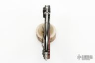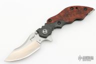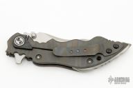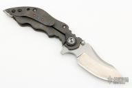 This Hard-1 framelock flipper by Yuna Knives features a satin finished blade with dual thumb studs, notched thumbrest and flipper. The handle has marble carbon fiber bolster, burl wood scale, flamed titanium frame and tip up clip. Fileworked titanium backspacer. Rides on bearings, nice detent and lockup. Comes with a zippered case. Has a few scratches, otherwise excellent condition.