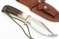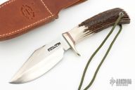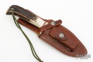 This knife has a satin finished stainless steel blade, with sharpened top edge and a notched thumbrest, .218" blade stock and 1.698" depth, hidden tang construction. The handle has nickel silver guard and a stag handle with red/white/blue spacers. Comes with brown leather sheath and original paper wrapping. Excellent condition.