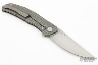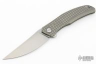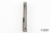 This Quantum MEFP by Shirogorov features a stonewashed Cromax PM blade with notched thumbrest and flipper. The handle has a tumbled and milled titanium frame, backspacer, tip up titanium clip with hidden screws. Rides on SRB, nice detent, lockup and blade seating. Comes with original box and COA. New condition.
