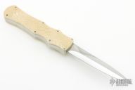 This Burn Custom Razor OTF has a mirror polished hollow ground double edged blade. The chassis is cut from 416SS, with Juma Ivory Snakeskin Scales. Sterling silver bullet-hole skull inlayed into wasp button. Blade deploys with authority and locks up tight. Comes with a zippered case and COA dated 12-6-20. Excellent condition.