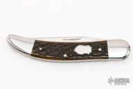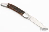 This Toothpick by Richard Rogers features a hand rub satin finished blade with nail nick. The handle has stainless steel bolsters with integral liners and cap, jigged bone covers with stainless steel shield escutcheon, stainless steel spring. Comes with original box. Has a couple very light scratches, otherwise excellent condition.