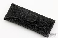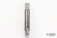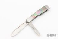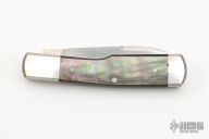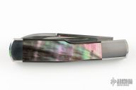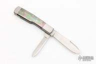 This Gunstock by Richard Rogers features hand rub satin finished blades with nail nicks. The handle has integral stainless bolsters/liners/cap, black lip pearl covers, stainless steel springs. Frame edges are beveled. Has half-stops, flush in all positions. Comes with a stingray skin pouch and COA. Has some light scratches, a couple small oxidation spots on the bolsters, otherwise good condition.