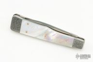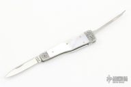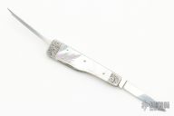 This Lobster Pattern Gunstock Slipjoint by C Gray Taylor features hand rub satin finished blades with nail nicks. The handle has engraved stainless steel bolsters and cap, coin edged stainless steel liners, mother of pearl covers with gold pins. Excellent condition. Comes with a leather pouch. Engraving done by Simon M Lytton.