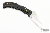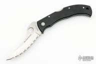This C60S Massad Ayoob by Spyderco features a satin finished fully serrated blade with thumbhole and notched thumbrest. The handle has a black aluminum frame with a black tip down reversible stainless clip. Comes with original box. Has some light scuffs, great condition otherwise.