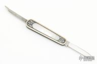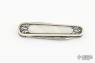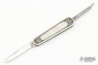 This slipjoint by C Gray Taylor features a hand rub satin finished blade with nail nick. The other blade is a nail file with nail nick. The handle has stainless steel covers that have been engraved and inlaid with gold, has mother of pearl inlays. Engraving done by "C.G.". Has some light scratches, otherwise excellent condition. Comes with a felt pouch.