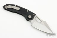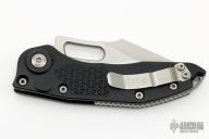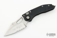 This Stitch Auto by Microtech Knives features a stonewash finished blade and false top edge, notched thumb and finger rests. The handle has a black milled aluminum handle with a bead blasted titanium backspacer and a bead blasted stainless  steel clip, tip up carry, lanyard hole at the butt. Comes with original box and papers. S/N of 10810 and dated 08/2022. Excellent condition.